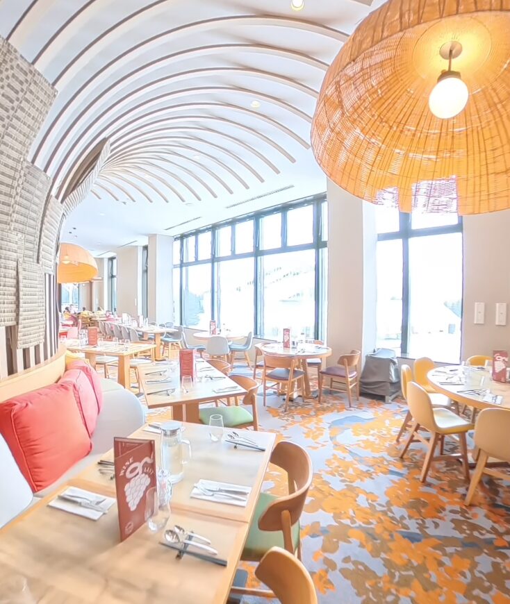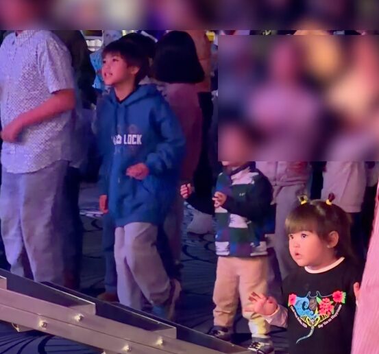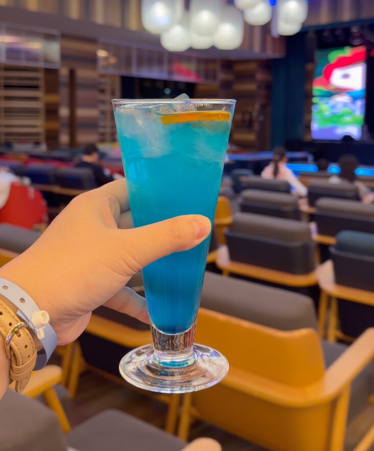 シアターはとても広い空間で、ステージの前に広場があり音楽がかかっています。子どもが踊り出すのを眺めながら、大人はゆっくりドリンクを片手にくつろげる設計。外国人の家族連れがとても多く、すでに「ここ、海外じゃない?」という雰囲気がじわじわ始まっています。