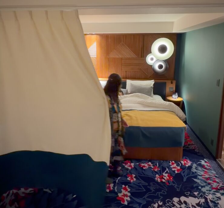 部屋はとても過ごしやすく、(部屋のタイプによるけど)カーテンで空間を仕切れる設計が子連れ旅行には神でした。子どもが先に寝ても、大人のエリアに明かりがついていても起こしにくい構造。赤ちゃん連れへの配慮もしっかりあって、ベビーベッド・ベビーバス・赤ちゃん用アメニティが最初から部屋に用意されていました。
