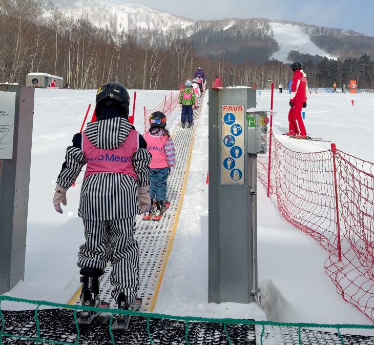 初心者向けにはマジックカーペット(動く歩道式の登坂装置)があり、リフトに乗れない小さな子も楽に斜面の上まで行けます。カラフルなポールが立っていて楽しい雰囲気。本当の初心者(4歳くらい)はマジックカーペット手前のフラットエリアで練習できて、スタッフが前で待ってくれます。