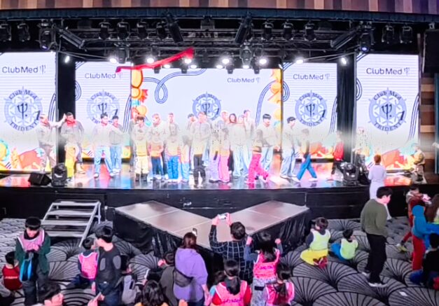 夏に空中ブランコをやっているサーカスチームが、空中フラフープやロープのパフォーマンスを披露。圧巻のパフォーマンスに加え、フロントスタッフやミニクラブのスタッフがダンスで周囲を盛り上げ、気づいたらみんなで踊っている状態に。